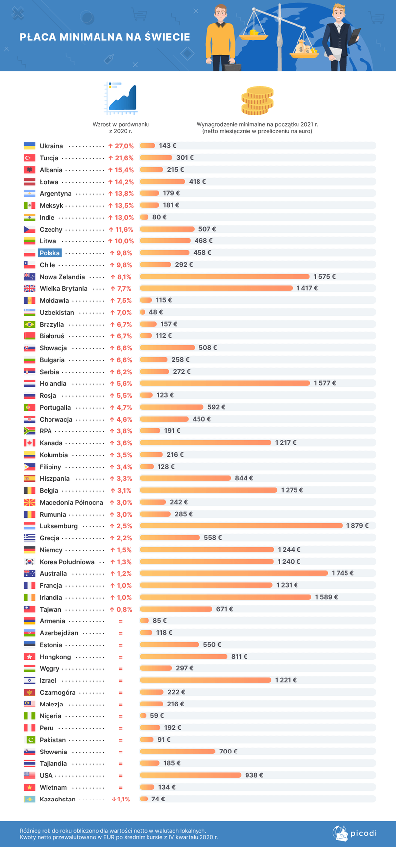 Komisja europejska w styczniu 2021 roku przedstawiła projekt o wprowadzeniu tzw. W polsce płaca minimalna ma głębokie tradycje i obowiązywała nawet w czasach głębokiej komuny. Płaca minimalna w 2021 roku wyniesie 2800 złotych. Co istotne, do podstawy płacy minimalnej oprócz wynagrodzenia zasadniczego wlicza się szereg dodatków i innych świadczeń pracowniczych. Z drugiej strony obserwujemy również silny trend podnoszenia pensji minimalnej: